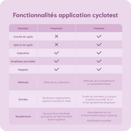 Sinon, vous pouvez continuer à utiliser l’application en version Freemium. Vous pouvez toujours transférer les valeurs mesurées avec votre thermomètre mySense vers votre application cyclotest et l’évaluation continue à être effectuée selon la méthode de la température. Vous n’aurez plus accès à votre courbe de cycle et à l’aperçu détaillé de votre cycle.