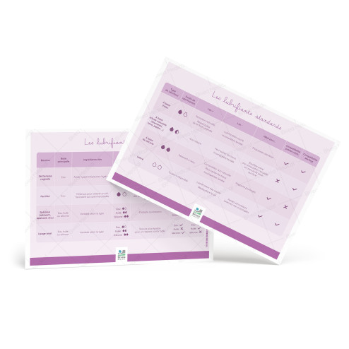 - Le poster possède un recto et un verso. Au verso, on retrouve le tableau sur les lubrifiants dits standards (à base d'eau, d'huile ou de silicone) et au recto, on retrouve le tableau des lubrifiants dits spécifiques (sécheresse, fertilité, relaxant, usage anal).