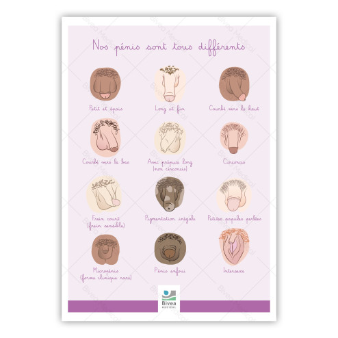 Ce poster anatomique met en lumière la diversité des formes du pénis. Il s’agit d’un support pédagogique simple et accessible, conçu pour montrer de manière visuelle que chaque pénis est unique dans sa morphologie, tant en longueur qu’en épaisseur ou en forme.