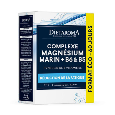 Manque d'entrain, baisse de la concentration, sensation de fatigue générale… Le Complexe Magnésium marin + B6 & B5 de Dietaroma associe la puissance du magnésium d'origine marine à une synergie de 5 vitamines pour une efficacité renforcée.
