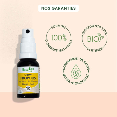 Le Spray Propolis Large Spectre Gorge BIO d’Herbalgem est une solution naturelle et concentrée, idéale pour apaiser la gorge dès les premiers signes d’agression ou de refroidissement. Grâce à une synergie puissante de propolis pure, de plantes médicinales, de bourgeons frais et d’huiles essentielles, ce spray agit localement pour soulager rapidement l’inconfort tout en stimulant les défenses immunitaires.