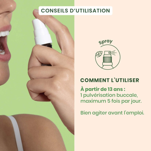 - A partir de 18 ans : 1 pulvérisation buccale, maximum 5 fois par jour. Bien agiter avant l’emploi.