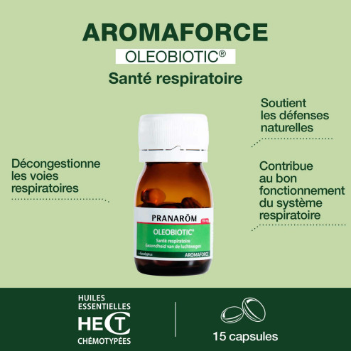 Spécialement conçue pour maintenir la santé des voies respiratoires, la formule OLEOBIOTIC associe les Huiles Essentielles d'Eucalyptus 100% pures, biologiques et intégrales d'Origan, de Cannelle de Chine, de Pin sylvestre et d'Eucalyptus radié.