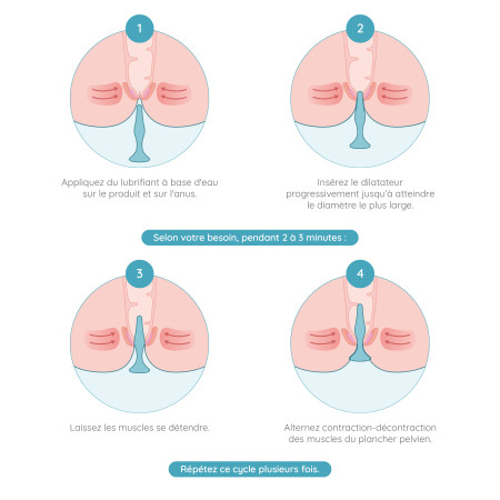 Pour l'insérer, inspirez profondément, puis introduisez doucement le dilatateur dans l'anus. Continuez à respirer profondément et à insérer le dilatateur plus profondément à chaque inspiration.