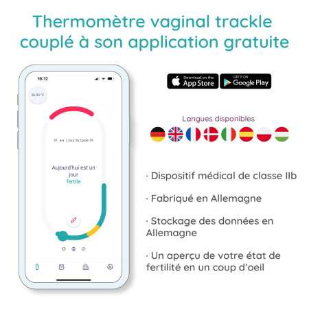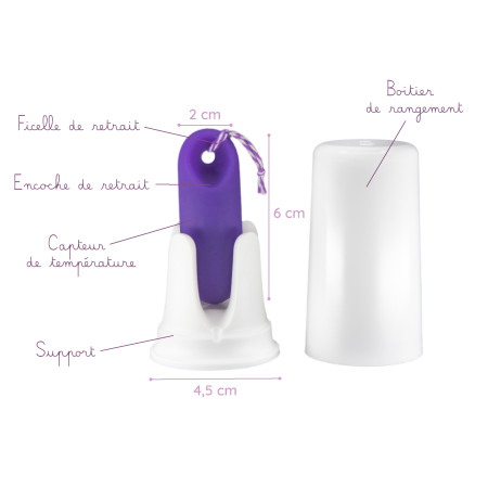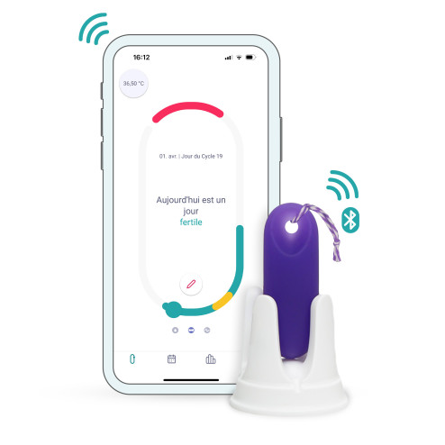 Thermomètre vaginal composé d'un capteur de température + une application de cycle pour déterminer la période fertile selon la méthode symptothermique. Il mesure la température basale en continu pendant la nuit et crée votre courbe de cycle pour un suivi fiable et précis.